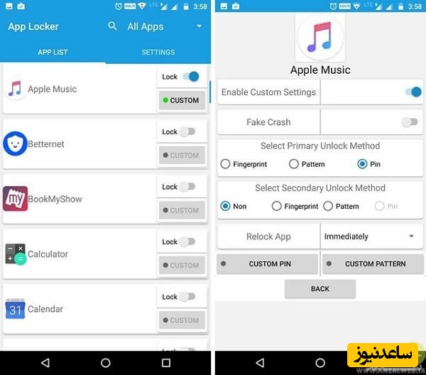 برنامه قفل حرفه ای اندروید با اثر انگشت و رمز توسط App Locker:Fingerprint & Pin: یکی دیگر از اپلیکیشن های قفل، App Locker است که به خاطر ظاهر قدیمی که دارد زیاد محبوب نیست اما دارای ویژگی های منحصر به فردی مثل توانایی تنظیم و شخصی سازی قفل ها برای هر اپلیکیشن است. با این ویژگی می توانید به عنوان مثال قفل یک برنامه را اثر انگشت و دیگری را رمز عددی بگذارید. این برنامه رایگان است اما برای حذف تبلیغات و نسخه پرو آن نیاز است که هزینه ای را پرداخت کنید.