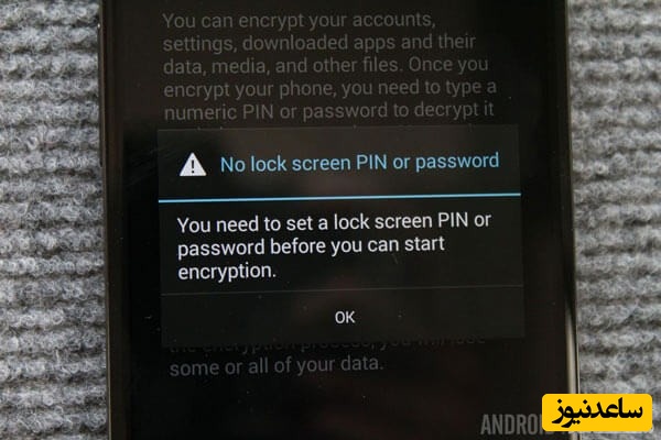 رمزگذاری در دستگاه هایی با اندروید 4.0 و پائین تر: اگر شما دارای دیوایسی با اندروید کیت کَت 4.4 و یا قدیمی تر از آن هستید ابتدا باید PIN کد و یا رمز عبور را قبل از شروع به فرایند رمزگذاری فعال کنید. خوشبختانه این کار خیلی ساه است و شما می توانید با اجرای مراحل Settings > Security > Screen Lock ابتدا PIN کد و یا پَترن مورد نظرتان را برای قفل صفحه نمایش انتخاب و فعال کنید. پس از اجرای این مرحله به منو تنظیمات برگردید و گزینه “Encrypt phone” یا “Encrypt tablet” را انتخاب کنید. در این مرحله دیوایس به شما پیام هشدار می دهد که ابتدا باید پسورد یا PIN کد خود را تصدیق کنید و سپس می توانید رمز جدید را برای اجرای عملیات رمزگذاری انجام دهید.