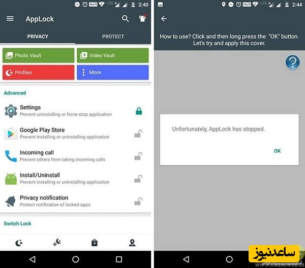 AppLock ، برنامه قفل گذاری حرفه ای برای اندروید: یکی از معروفترین برنامه های قفل گذاری موجود در گوگل استور، AppLock است که بیش از 100 میلیون بار دانلود شده است. با استفاده از این اپلیکیشن می توانید برنامه های مختلف مثل وای فای، بلوتوث، اینترنت گوشی و غیره را قفل کنید. حتی می توانید تماس های ورودی را قفل کنید و یا پروفایلهای قفل گذاری مختلف را تعریف کنید. یکی از گزینه های موجود در این برنامه، فعال شدن قفل در زمان و یا مکان خاص است، همچنین پیغامی مانند “the app hasstopped” که پیغامی متداول در اندروید است را نمایش دهد تا قفل بودن برنامه ها مشخص نشود.