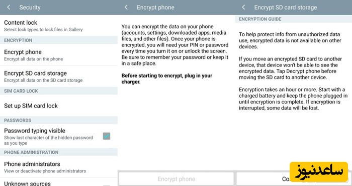 در این بخش حتما با گزینه “Encrypt phone” یا “Encrypt tablet” روبرو خواهید شد. حالا در این مرحله برای اطمینان از عدم خاموش شدن گوشی در حین اجرای روند از شما درخواست می شود تا دیوایس خود را شارژ کنید. اگر اولین بار است که می خواهید این قابلیت را فعال کنید از شما خواسته می شود تا PIN کد یا پسورد خود که در هنگام روشن و خاموش کردن دیوایس استفاده می کنید را وارد کنید. اکنون می توانید پسورد جدید را برای رمزگذاری فایل های خصوصی انتخاب کنید اما مطمئن شوید که این رمز را فراموش نخواهید کرد.