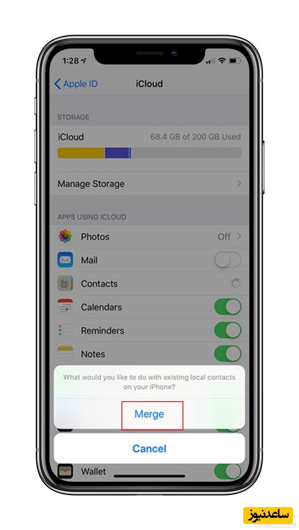 در تصویر قبل اگر گزینه contacts یا مخاطبین به طور پیش فرض سبز رنگ باشد یعنی مخاطبین شما از قبل در فضای ذخیره سازی ابری وجود دارند. در صورتی که گزینه مخاطبین فعال نباشد پس از فعال کردن پیغام زیر را دریافت می کنید که از شما سوال می کند قصد دارید از مخاطبین خود خروجی بگیرید که باید گزینه merge را انتخاب نمایید.