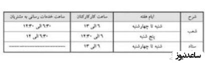 روزهای کاری شعب و ادارات امور شعب بانکی در طول هر هفته از شنبه تا پنجشنبه و ادارات کل برخی بانکها از شنبه تا چهارشنبه است.