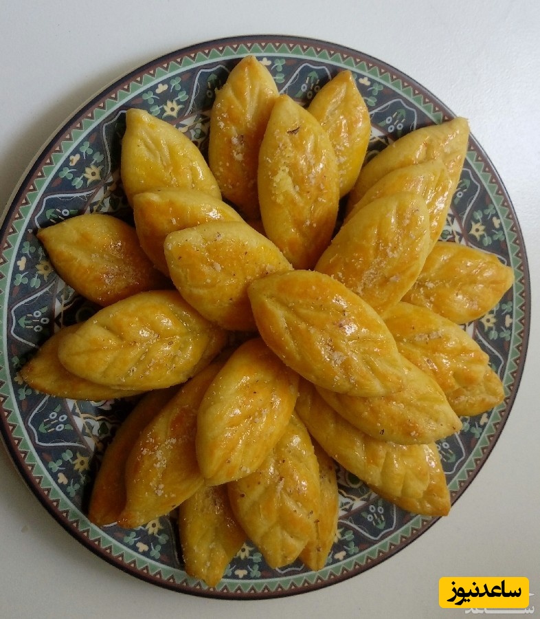 در این مرحله خمیر را با دست کمی فشار می دهیم تا صاف شود، سپس با مهر یا چنگال روی خمیر را به شکل برگ تزیین می کنیم. به همین ترتیب خمیر را اماده می کنیم و درون سینی فر قرار می دهیم (نیاز به چرب کردن سینی نیست)