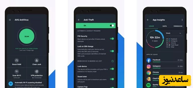 AVG AntiVirus Free: فایل های شما را رمزگذاری می کند تا بدون اجازه شما باج افزارها به فایل های شما دسترسی پیدا نکنند همچنین، مکان و اطلاعات دستگاه شما را از ابزارهای تبلیغاتی مزاحم و ردیاب های اینترنتی پنهان می کند. این برنامه آنتی ویروس دارای اسکن های عمیق برای یافتن هر گونه مشکل در تلفن همراه یا تبلت شما است. و باعث می شود که دستگاه شما سریع تر کار کند ، و حتی وب سایت ها را اسکن می کند و در صورت داشتن فایل ها یا پیوندهای مخرب در آنها به شما اطلاع می دهد. هنگام نصب AVG ، به خصوص در هنگام اسکن ویروس ، تأخیر قابل توجهی در تلفن های من وجود داشت. این که باید کمی بیشتر منتظر بمانید تا برنامه ها باز شوند، تحمل کندی سرعت برای من بسیار ناامید کننده است.