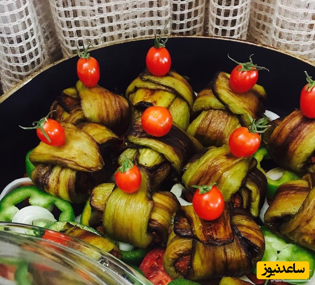 دو ورقه بادنجان را به صورت علامت+(افقی وعمودی)روی هم قرار داده، وسط آن گوشت بگذارید و مثل بقچه آن را ببندید. به همین شکل، تمام بادنجان ها را با مواد گوشتی بقچه کنید.