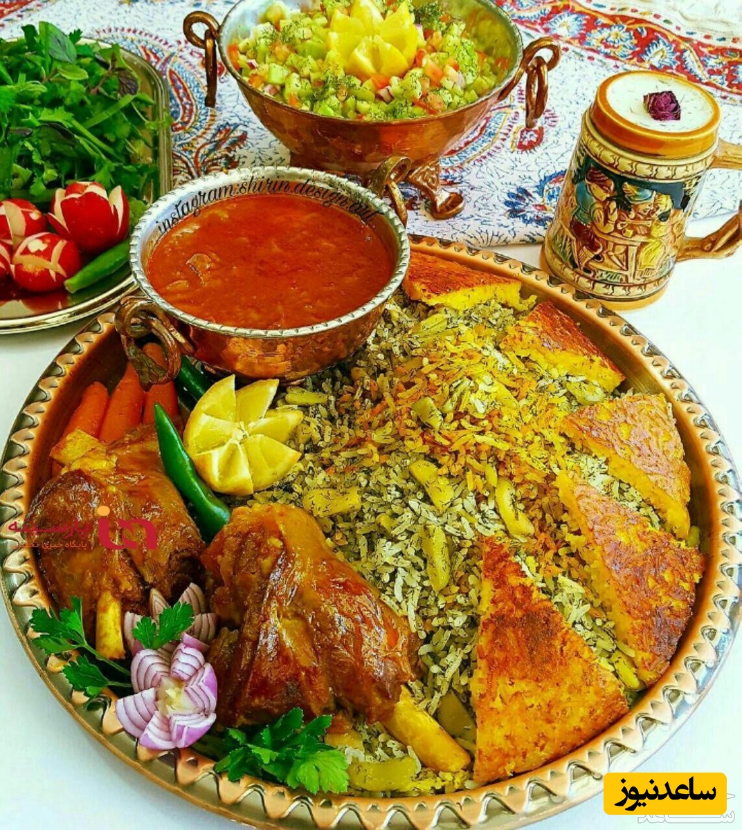 هنگام سرو قسمت زعفرانی را جدا کنید. مقداری از پلو را در دیس بکشید و روی آن، گوشت پخته بچینید و روی آنها را با پلو بپوشانید. سپس برنج زعفرانی را روی پلو بدهید.