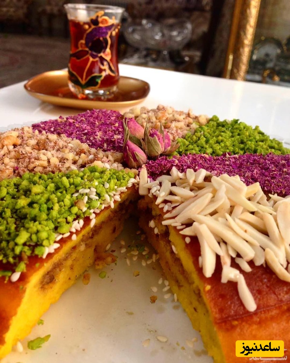 روی خاگینه را با باقی گردو ، بادام و پسته خرد شده تزیین کنید.