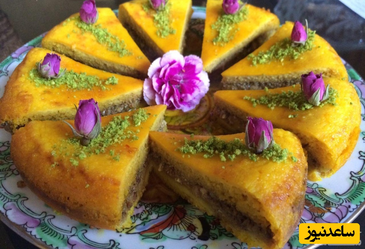 خاگینه را در ظرف چیده و روی آن دارچین وگردو وپسته خرد شده بپاشید.