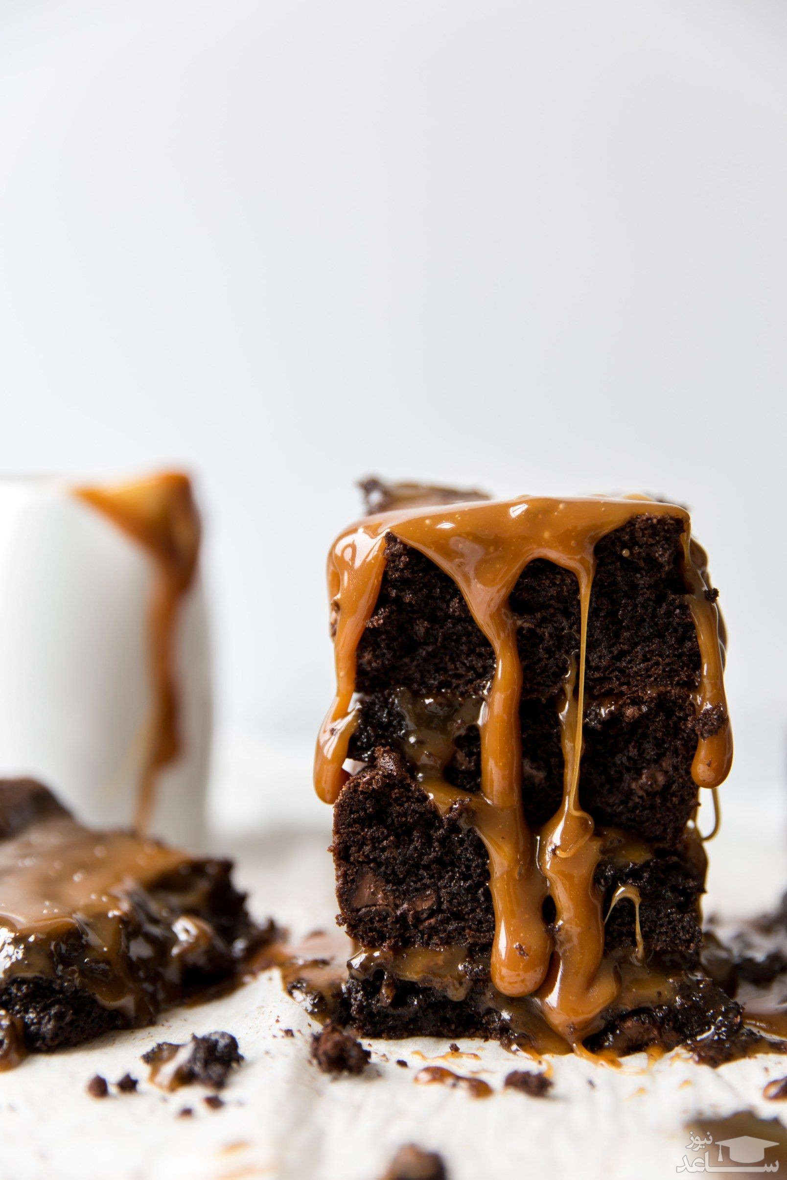 - براونی را به اندازه دلخواه برش داده، روی آن را با مرنگ فرم داده و روی آن را با شربت کارامل تزیین کنید.
