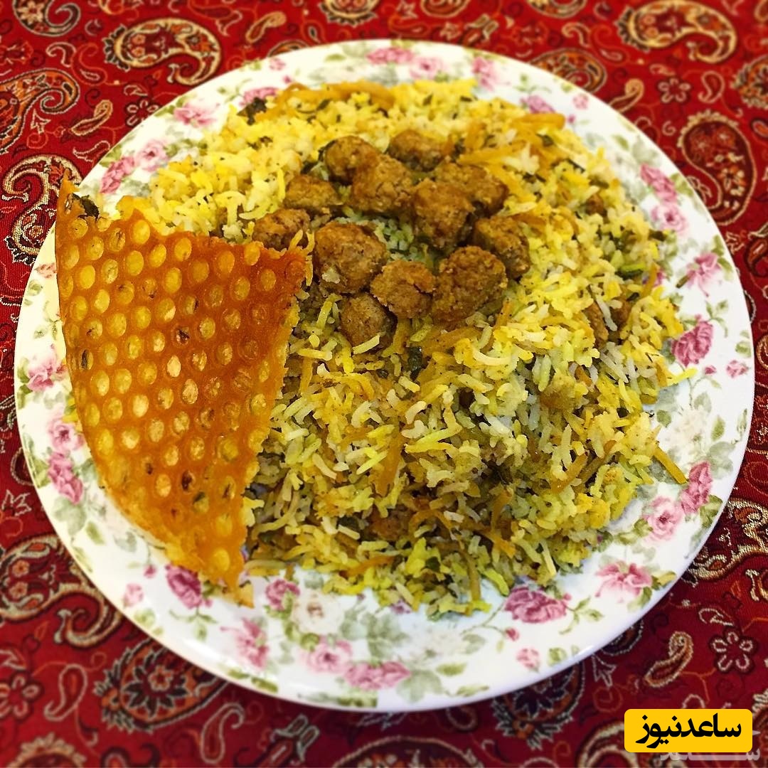 هنگام سرو، برنج زعفرانی را جدا کنید. پلو را در دیس بکشید و برنج زعفرانی را روی آن بریزید. کره آب کرده را روی برنج بدهید و سرو کنید.