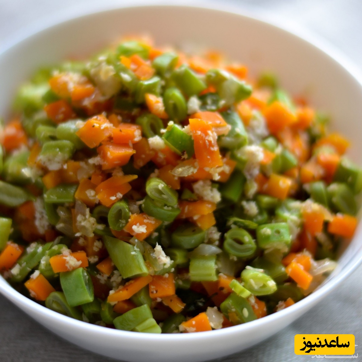 هویج و لوبیا را با آب مرغ، در قابلمه ای روی حرارت ملایم بپزید.
