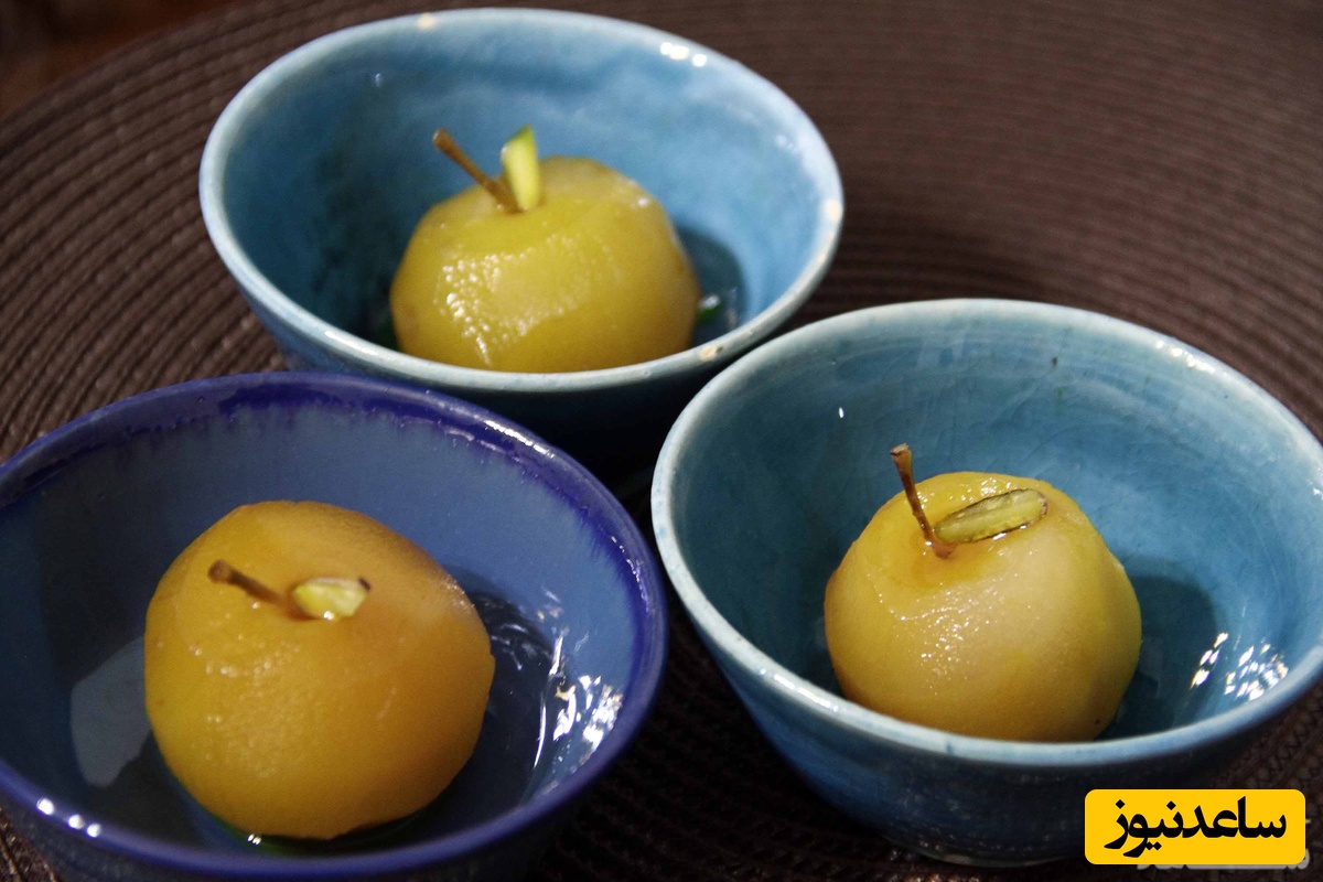 در صورت دلخواه، می توانید داخل شربت مربای سیب، 1 عدد لبوی خرد شده بریزید تا رنگ مربا قرمز شود.