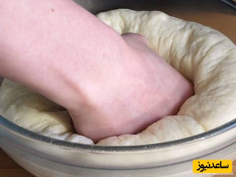 بعد خمیر را در یک کاسه که کمی چرب کردیم قرار میدهیم روی ظرف را با سلفون می پوشونیم به مدت یک ساعت تا 45 دقیقه استراحت می دهیم تا حجم خمیر دو برابر شود بعد از این مدت با انگشت روی خمیر فشار بدید اگر جای انگشت درخمیر فرو رفت و به آرامی پر شد خمیر آماده است اگر جای انگشت سریع پر نشد خمیر احتیاج به استراحت دارد خمیر را روی میز کار که کمی آرد پاشیدیم ورز بدید تا هوای داخل آن خارج شود نباید خمیر را چنگ بزنید باید با کف دست خمیر را ورز دهید تا یک دست شود.