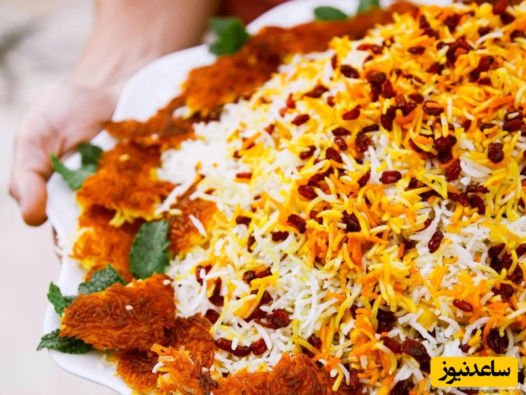با برنج زعفرانی و زرشک، روی برنج را تزئین کنید.