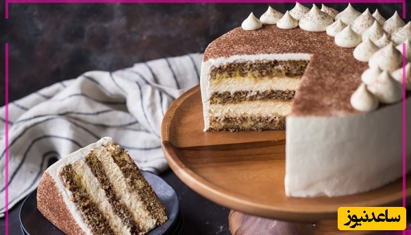 سطح تیرامیسو را با خامه شیرین قنادی بپوشانید و قطعات کوچک و خرد شده گردو را روی آن بپاشید. در اینجا میتوانید گردو را به 2 صورت خرد کنید. بخشی از آن را پودر کرده و بخشی دیگر را به قطعات درشتتر تقسیم کنید. ترکیب پودر گردو و قطعات گردو باعث میشود که طعم و ظاهر تیرامیسو بسیار زیبا و متفاوت باشد.