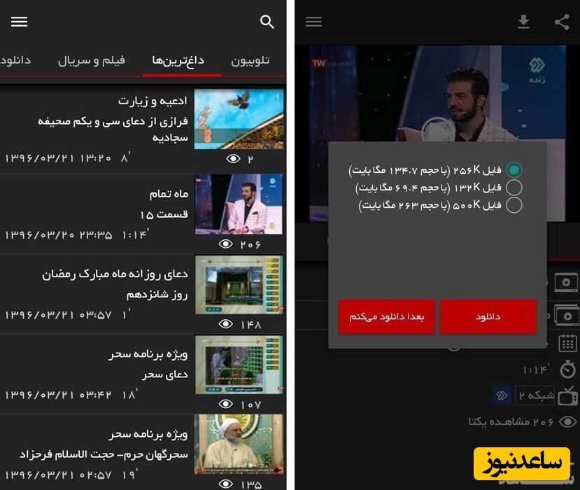 این سایت یک دسته بندی با عنوان داغ ترین ها دارد که لیستی از برنامه های پربیننده نمایش داده می شود. با انتخاب هر یک از برنامه ها می توانید به مشخصات برنامه و دیگر قسمت های برنامه مورد نظر دسترسی داشته باشید. با لمس اولین آیکون موجود در گوشه بالا و سمت راست صفحه امکان به اشتراک گذاری برنامه از طریق سایر اپلیکیشن ها فراهم می آید و با لمس دومین آیکون می توانید برنامه مورد نظر را دانلود کنید.