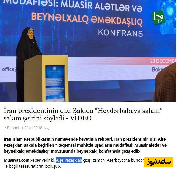 به گزارش سرویس سیاست ساعدنیوز، دختر و داماد مسعود پزشکیان بهعنوان سرپرست هیئت ایرانی به جمهوری آذربایجان سفر کردند. این هیئت در جریان سفر به باکو، تولد الهام علیاف رئیسجمهور آذربایجان را به او تبریک گفت. نکته قابلتوجه این سفر، واکنش برخی رسانههای باکو بود؛ آنها در گزارشهای خود نام دختر پزشکیان را از «زهرا» به «عایشه» تغییر دادهاند؛ موضوعی که مورد توجه کاربران و برخی رسانههای فارسیزبان قرار گرفته و درباره آن گمانهزنیهایی مطرح شده است.