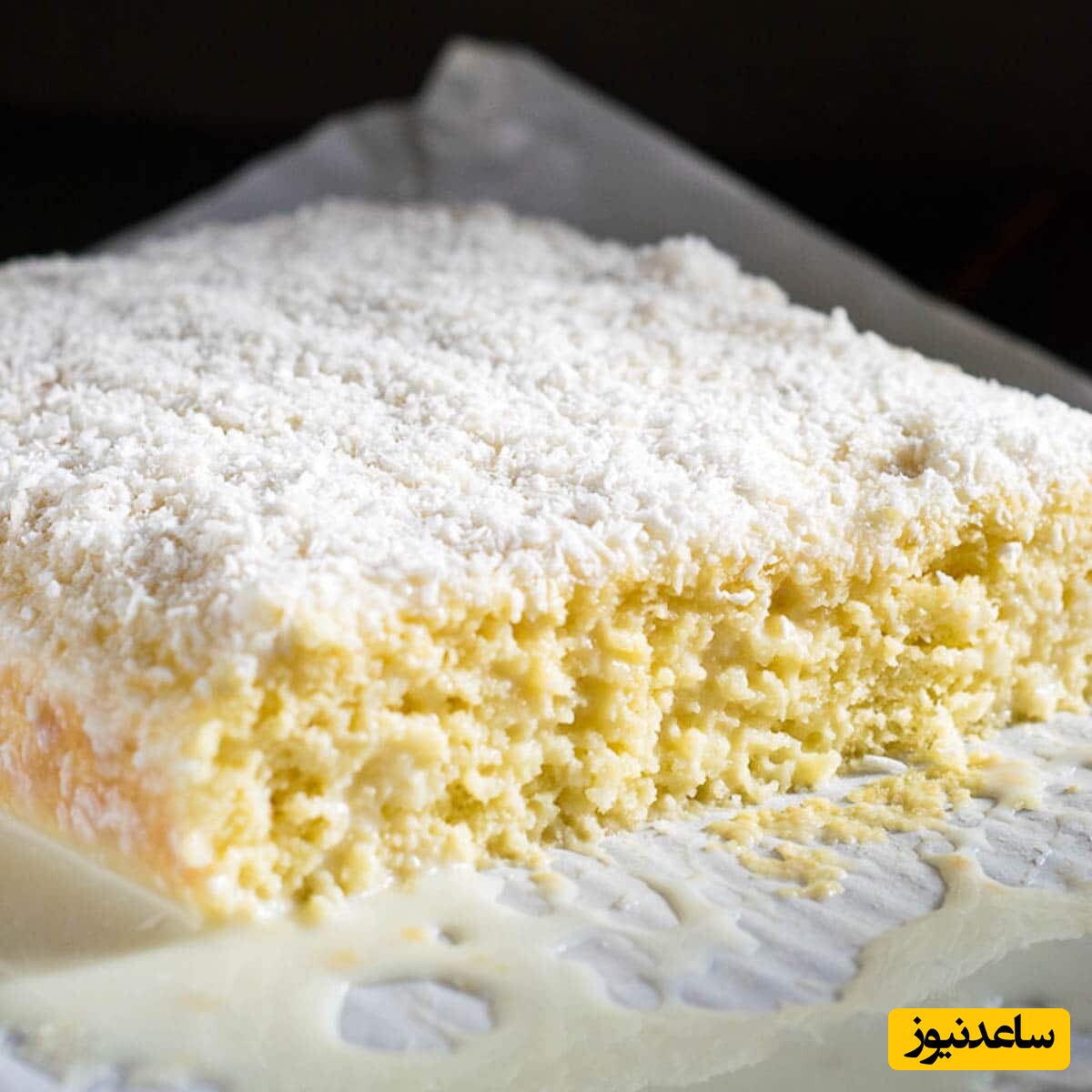 بعد از اینکه کیک پخت، قالب را از فر خارج کنید و اجازه بدهید کاملا خنک شود، سپس کیک را از قالب خارج کنید و با کمک یک چاقوی تیز کیک را به قطعات 10 در 10 سامنتیمتری برش بزنید. در مرحله بعد شیر عسلی، خامه و شیر را داخل یک کاسه بریزید و با همزن دستی هم بزنید تا به صورت یکدست مخلوط شود. حالا قطعات کیک را اول داخل محلول شیر و خامه بغلتانید، سپس داخل پودر نارگیل بغلتانید و بعد هر قطعه را داخل یک تکه فویل بپیچید و آنها را به مدت 2 ساعت داخل یخچال بگذارید، سپس از فویل خارج و سرو کنید، نوش جان.