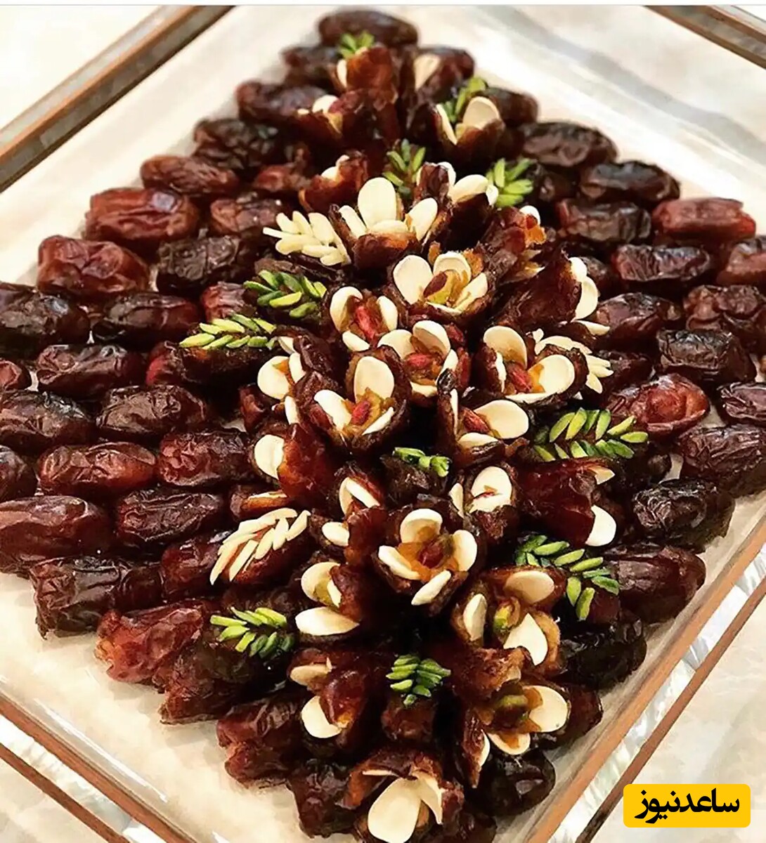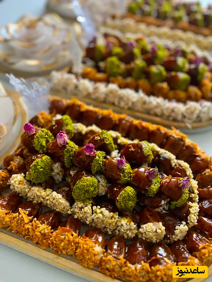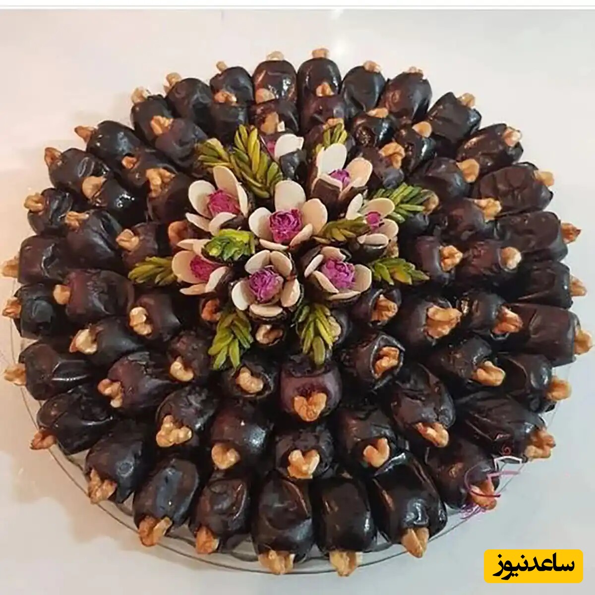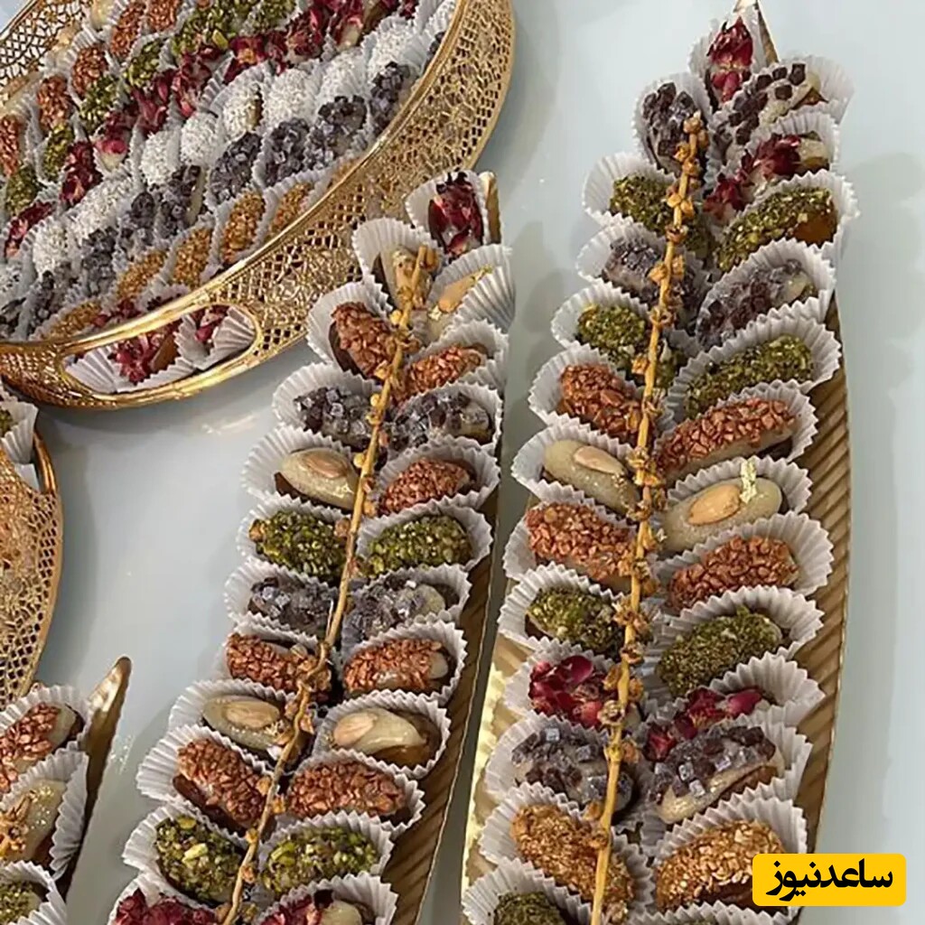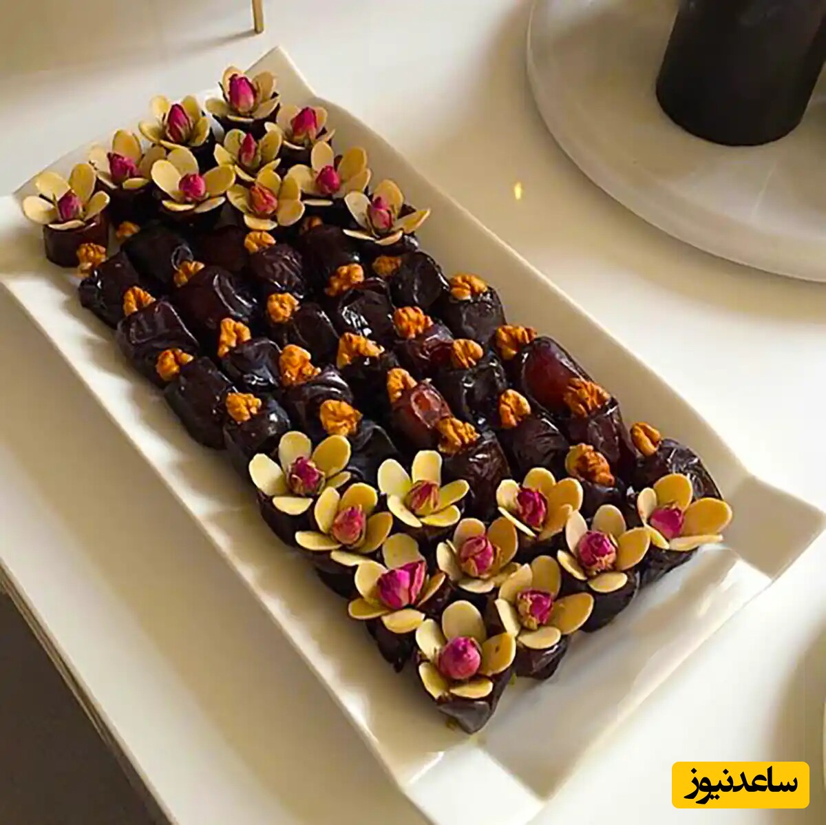 اگر مراسم خیلی خاصه، کمی ورق طلای خوراکی (gold leaf) روی خرما قرار بده؛ فوقالعاده لاکچری!