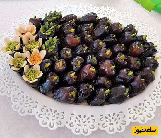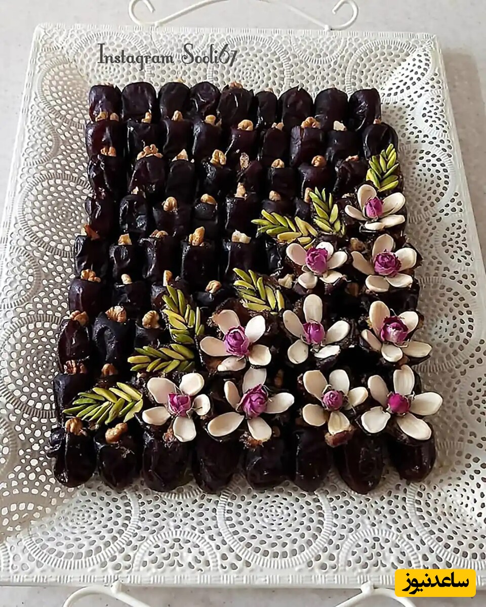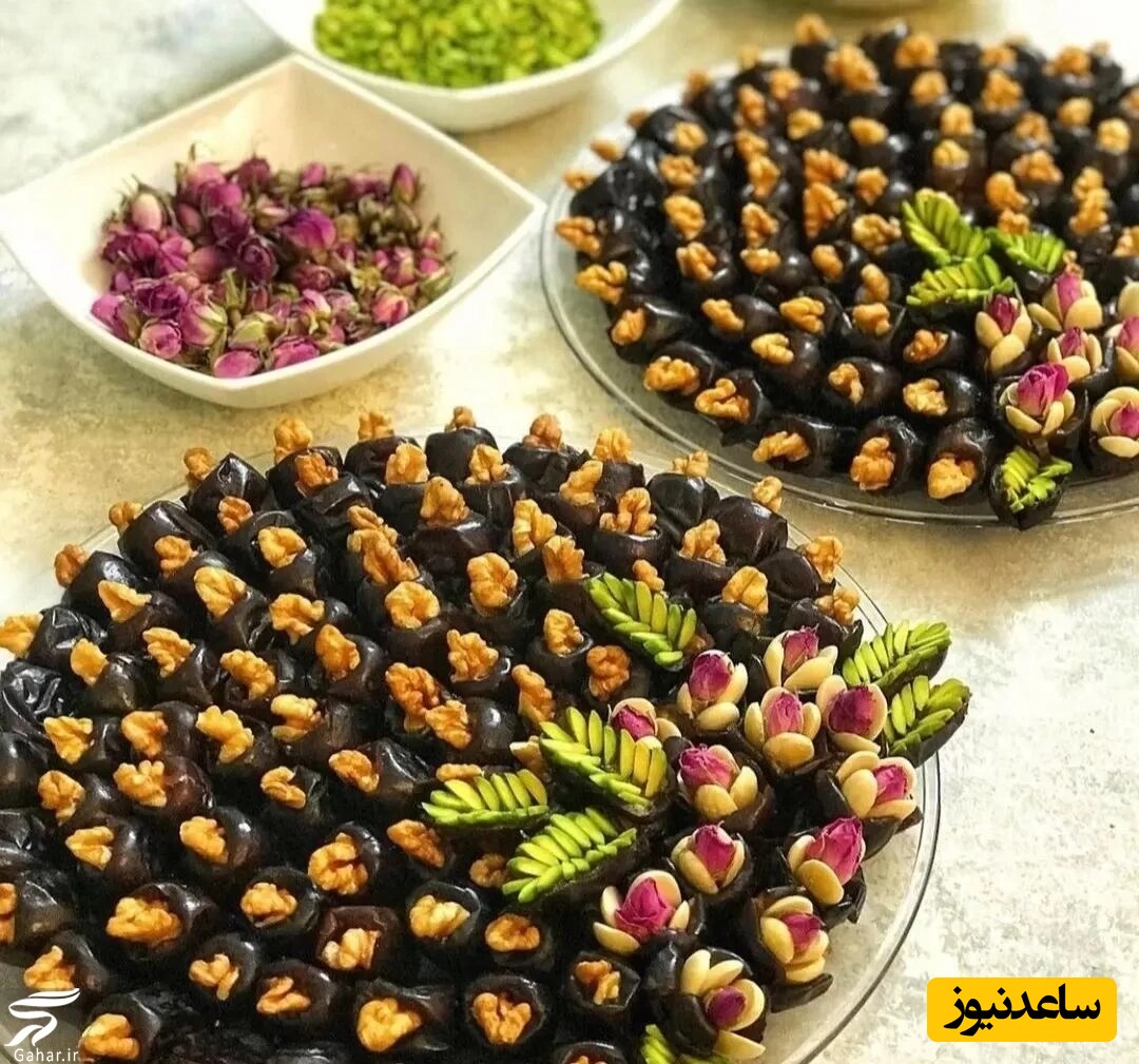 خرماها رو در ظرف بچین و روی هر کدوم کمی پودر گل محمدی و خلال پسته بریز؛ معطر، رنگی و زیبا.