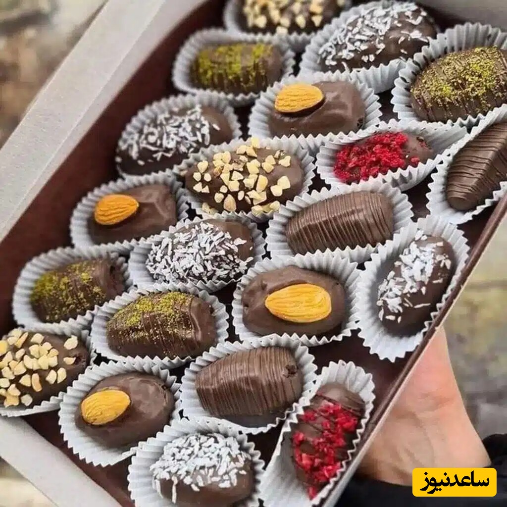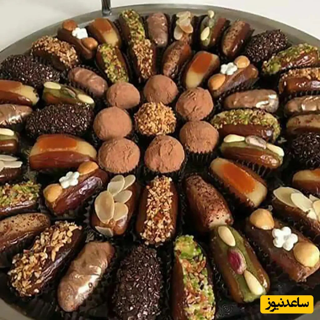 خرماها رو در شکلات آبشده (قهوهای یا سفید) بغلتون و رویشون با خلال بادام یا پودر نارگیل تزئین کن. میتونه مثل شکلاتهای مجلسی در ظرف کریستالی چیده بشه.