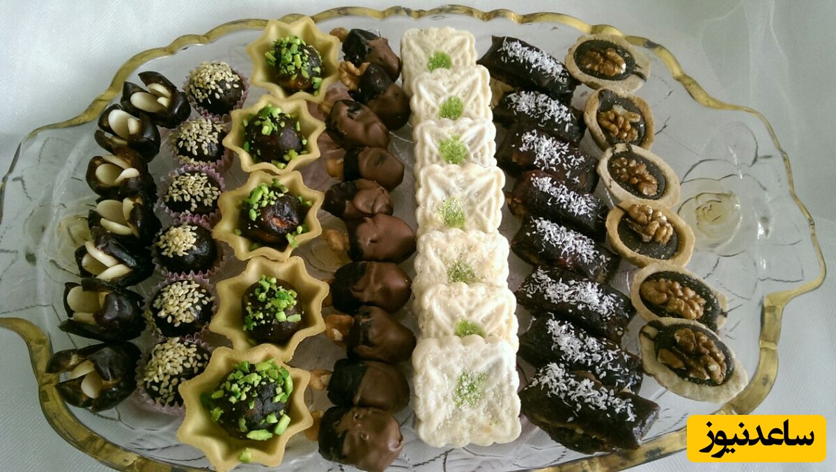 خرماها رو به صورت طبقهای با رنگبندی پودرها (پسته، نارگیل، کنجد) بچین تا جلوه میز خاصتر شه.
