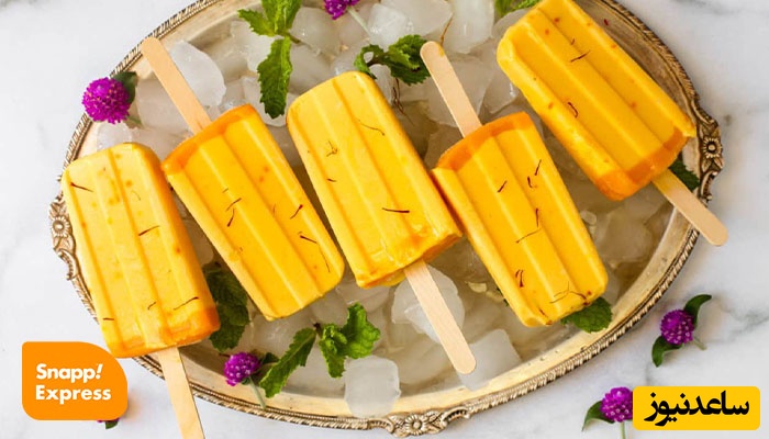 چند پر از زعفران را داخل قالب بستنی بیندازید و سپس مخلوط اسکمو انبه را داخل قالب بریزید.