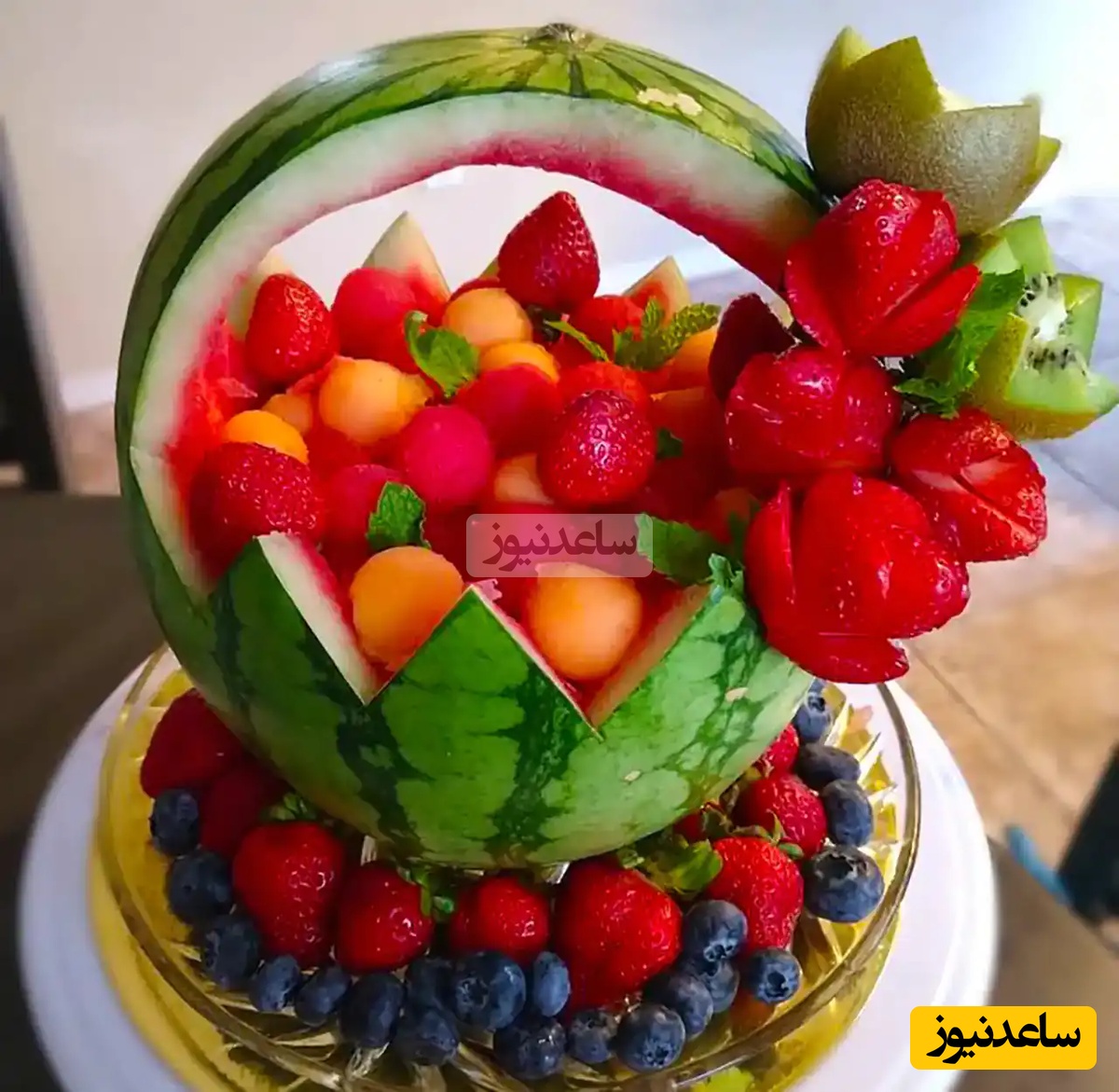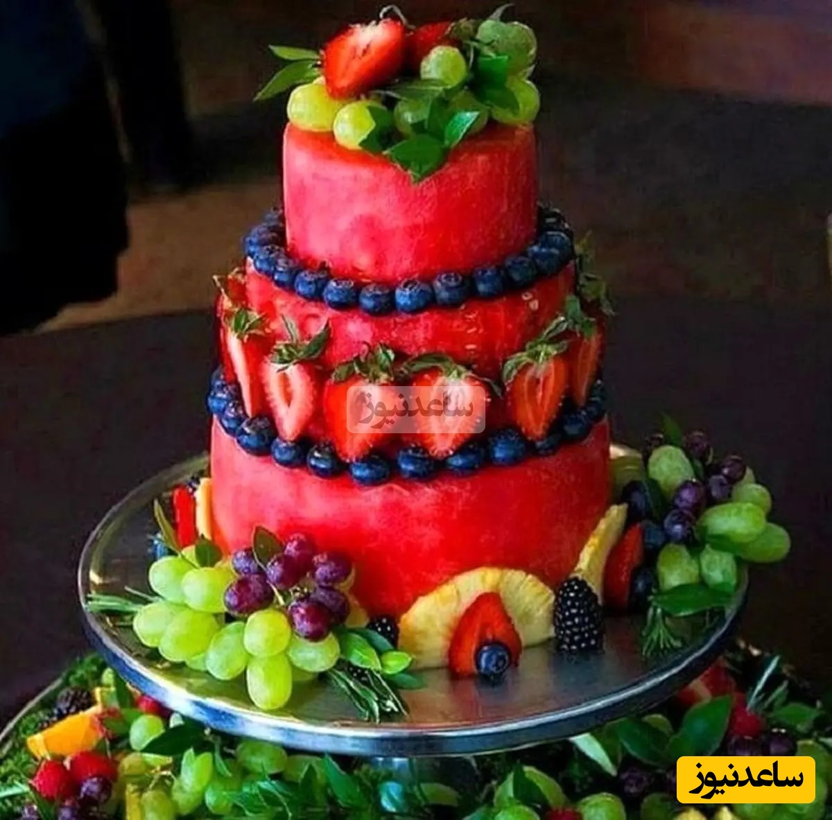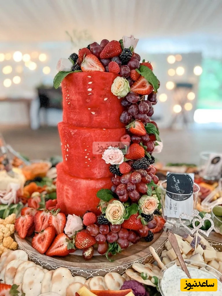 در نهایت اطراف کیک هندوانهای خود را با میوههای دیگر و گلهای طبیعی تزیین کنید.
