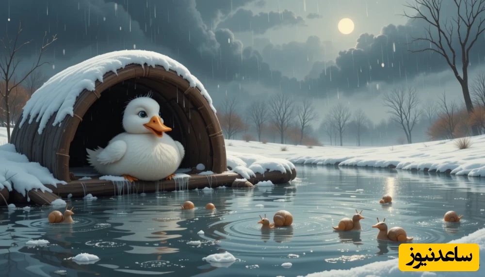 هرچه بارون بیشتر می بارید، آبگیر مواج تر می شد. مدتی که گذشت، بارون تبدیل شد به برف. دانه های درشت برف، رقص کنان روی زمین می نشستن و زمین رو با فرشی از سفیدی می پوشوندن. برف هایی که توی آبگیر می ریختن، خیلی زود توی آب یخ آلود اون ناپدید می شدن. چندین ساعت برف بارید. وادل، نوک و سرش رو لای پرهای بالش فرو برد و به خواب رفت.