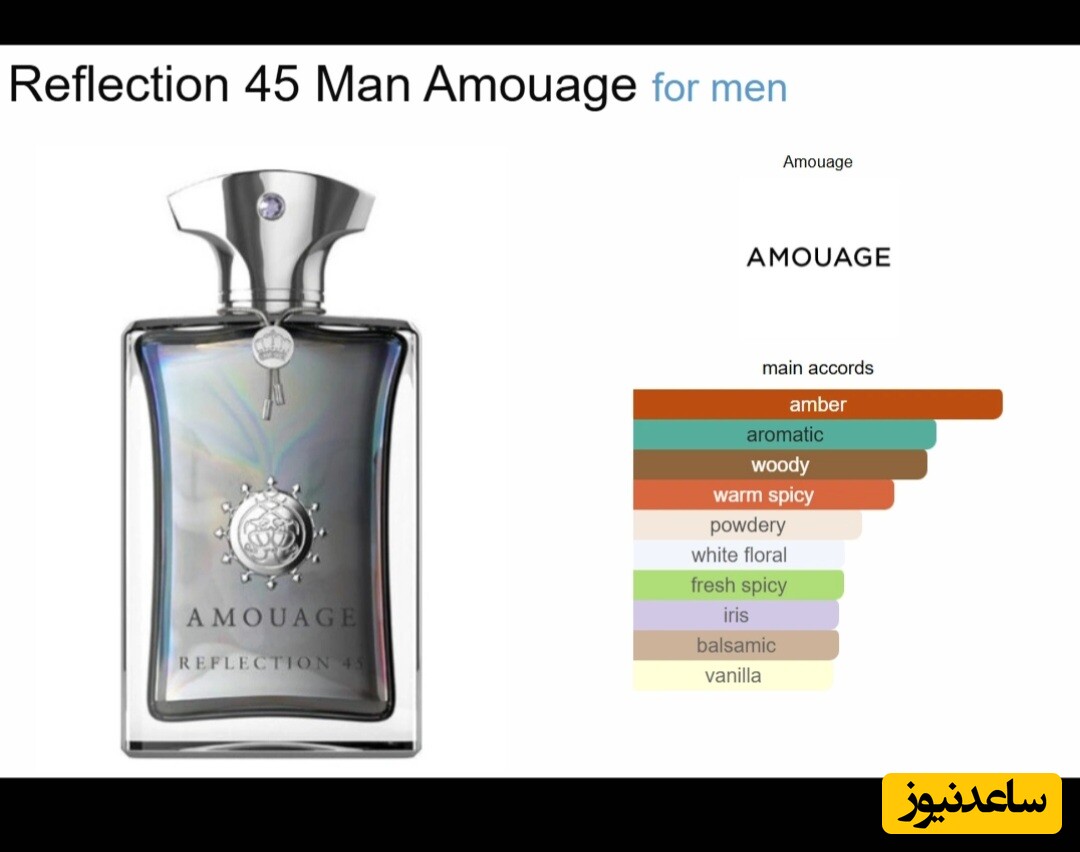 آمواج رفلکشن 45 (Amouage Reflection 45): این عطر با ترکیبی از گلهای سفید، کهربا و وانیل، رایحهای شرقی و ادویهای را ارائه میدهد که حس لطافت و شادابی را منتقل میکند.