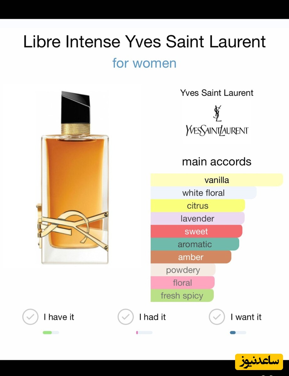 ایو سن لورن لیبره اینتنس (Yves Saint Laurent Libre Intense): این عطر با ترکیبی از اسطوخودوس، شکوفه پرتقال و وانیل، رایحهای گلی و وانیلی ارائه میدهد که مورد پسند بسیاری از آقایان است.