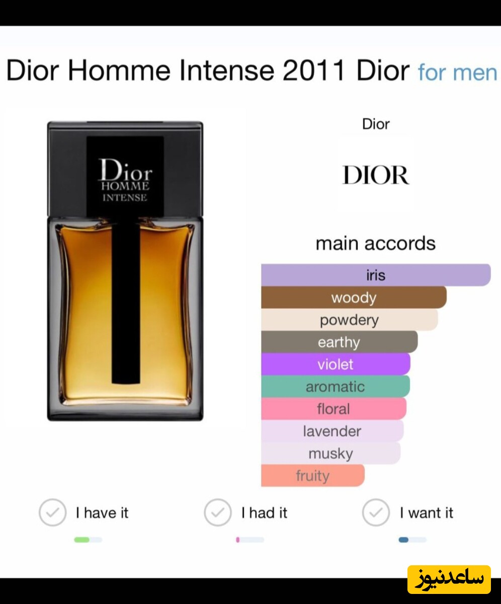 دیور هوم اینتنس (Dior Homme Intense): عطری با رایحهای غنی و پیچیده از زنبق، مشک و وانیل که حس ظرافت و گرما را منتقل میکند و مورد تحسین بسیاری از بانوان قرار گرفته است.