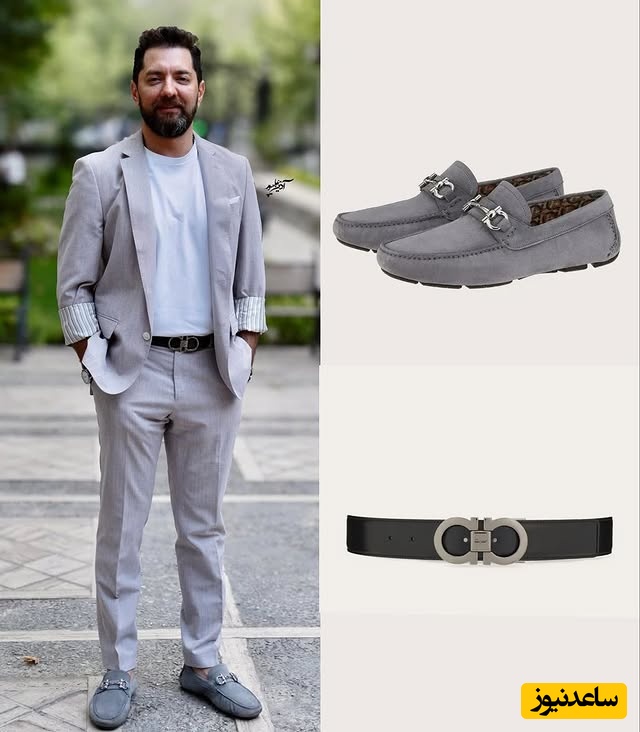 در فصلهای اخیر تا کردن آستینهای کت به صورتی که آستر اون مشخص باشه حسابی ترند شده بود که بهرام رادان هم ازش پیروی کرد. کفشهای لوفر جیر طوسی رنگ و کمربند این اوتفیت از برند Salvatore Ferragamo انتخاب شده بود که در هرم فشن جزو برندهای لوکس بی سر و صدا یا همون لوکس آرام به حساب میاد.