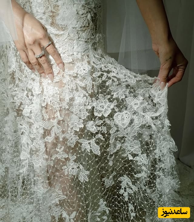 لباس دوم سلینا گومز ظاهر کاملا لطیفتری داشت و سراغ لباسی گیپور با پارچهی شفاف و جزئیات گلدار رفت که در قسمت دامن حروف اول اسم این زوج دستدوزی شده بود و حالهوای رمانتیکتری داشت.