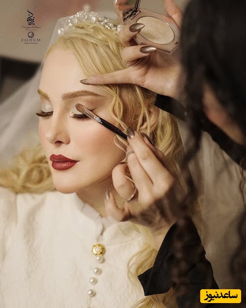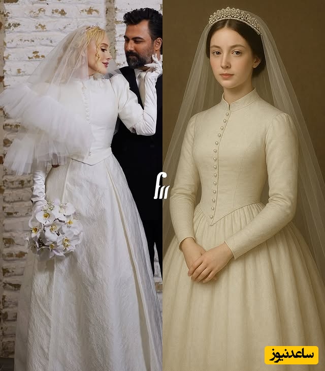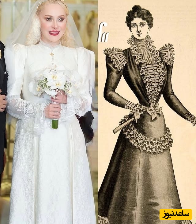 ارام جعفری با انتخاب لباسی متفاوت، سراغ استایلی رفت که حالوهوای کلاسیک اروپای قرن نوزدهم رو یادآوری میکنه. لباس عروس با یقهی بسته، دکمههای مرواریدی و آستینهای بلند طراحی شده بههمراه فرم تاج و مرواریدهایی که در تاج کار گذاشته شدن، جزئیاتی هستن که ما رو به دوران ویکتوریایی و ادواردیَن میبره. ازطرفی پارچهی مات با بافتی لطیف و بدون درخشش زیاد، جلوهای اشرافی ولی ساده ایجاد کرده که با پارچههای قرن نوزدهم همخوانی بسیار زیادی داره. در مقابل، کتوشلوار مشکی بابک انصاری با فرم ساختاریافتهاش تضاد قشنگی با لطافت لباس عروس ساخته و ترکیبشون رو متعادل کرده. ازطرفی نورپردازی کم و استفاده از نقاشی و پرترههای افراد مشهور در قرن هجدهم و نوزدهم و بکگراند زرشکی رنگ، کاملا مطابق با حالوهوای قرون گذشته بوده که فاخر هم به نظر میرسه و حسی دراماتیک رو منتقل میکنه. دستهگل زرشکی و ماشین کلاسیک هم میتونه مهر تاییدی باشه که این زوج تصمیم گرفتن تا برای مهمترین روز زندگیشون ظاهری کلاسیک و تاریخی رو برای خودشون بسازن