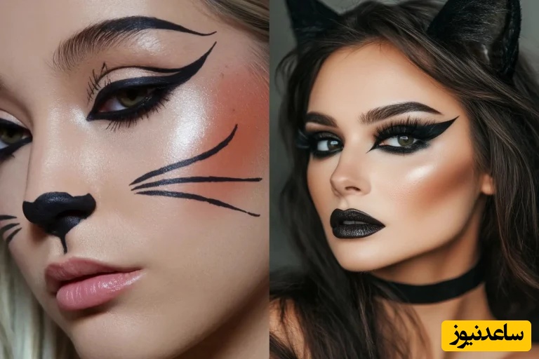 برای اجرای این میکاپ محبوب، خط چشم کشیده،یکی از اصول مهم است تا چشمها شبیه به فرم چشم گربه شود. میتوانید با خط چشم مشکی یک دماغ مثلثی مشکی و چند سبیل ظریف روی گونهها هم طراحی کنید تا گریم هالووین شما تکمیل شود. استفاده از تل با طرح گوش گربه خلاقیت بیشتر شما را میرساند.