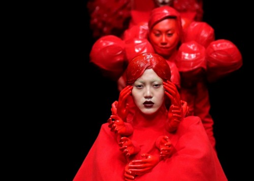 شوی طراح هو شگوانگ، شورش قرمز و ناراحت کننده بود لمس هایی مانند مدلی که دو عروسک را در دست دارد که انگار آنها هستند غرق در خون بودند فیگورهای شاخدار و پروتزهای متعدد دست هایی که گردن لباس ها را زینت می دهند. این طراح مد چینی هلندی مدل های خود را به پایین فرستاد کت واک در خلاقیت های کابوس وار در نمایشگاه پکن، با پاشیدن لیبرال خون جعلی شوی طراح هو شگوانگ در هفته مد چین یک ماجرای شوم با مدل هایی که فقط لباس قرمز پوشیده اند، با لمس هایی مانند شاخ شیطان و خون تقلبی این نمایش پر بود از چیزهای ناراحت کننده مانند برگزاری یک مدل دو عروسک که انگار غرق در خون بودند لباس مجلسی قرمز با ماسک جعلی و شاخ های شیطان بزرگ. یکی دیگر در حالی که با یک مدل راه می رفت، منظره ای وحشتناک ایجاد کرد که به نظر می رسید می تواند دوقلوی او باشد. ظاهر این جفت شوم با پوشیدن یکی بهتر شد بالاپوشی که خیلی شبیه جلیقه بود و بازوهایش را به او بسته بود طرفین یک دست جعلی از روی شانه هایشان بیرون زده بود. حتی موهای مدل ها هم قرمز بود و ظاهری براق داشت. احتمالاً همان طور که نشان داده شد، ظاهر خون جاری را تکرار می کند از مجموعه پاییز زمستان 2016 طراح. یک لباس پی وی سی با یک گل بزرگ روی شانه ساخته شده برای یک سایت دراماتیک، و حتی با پوشیدن مدل جذاب تر بود یک ماسک همسان که تمام صورت او را با دو شکاف برای آن پوشانده است چشم و یکی برای دهان.