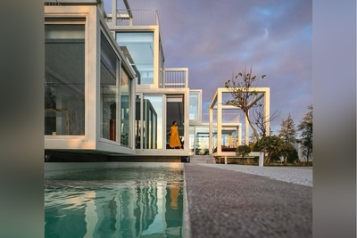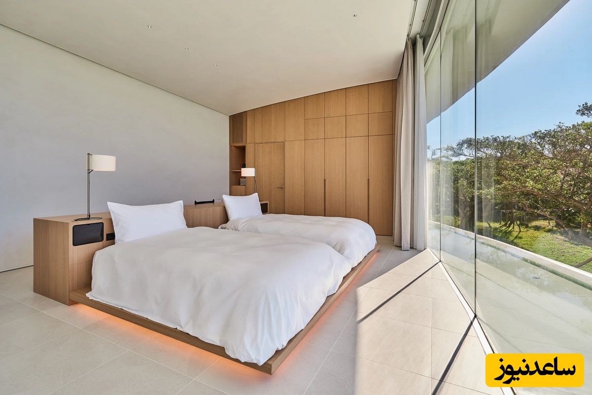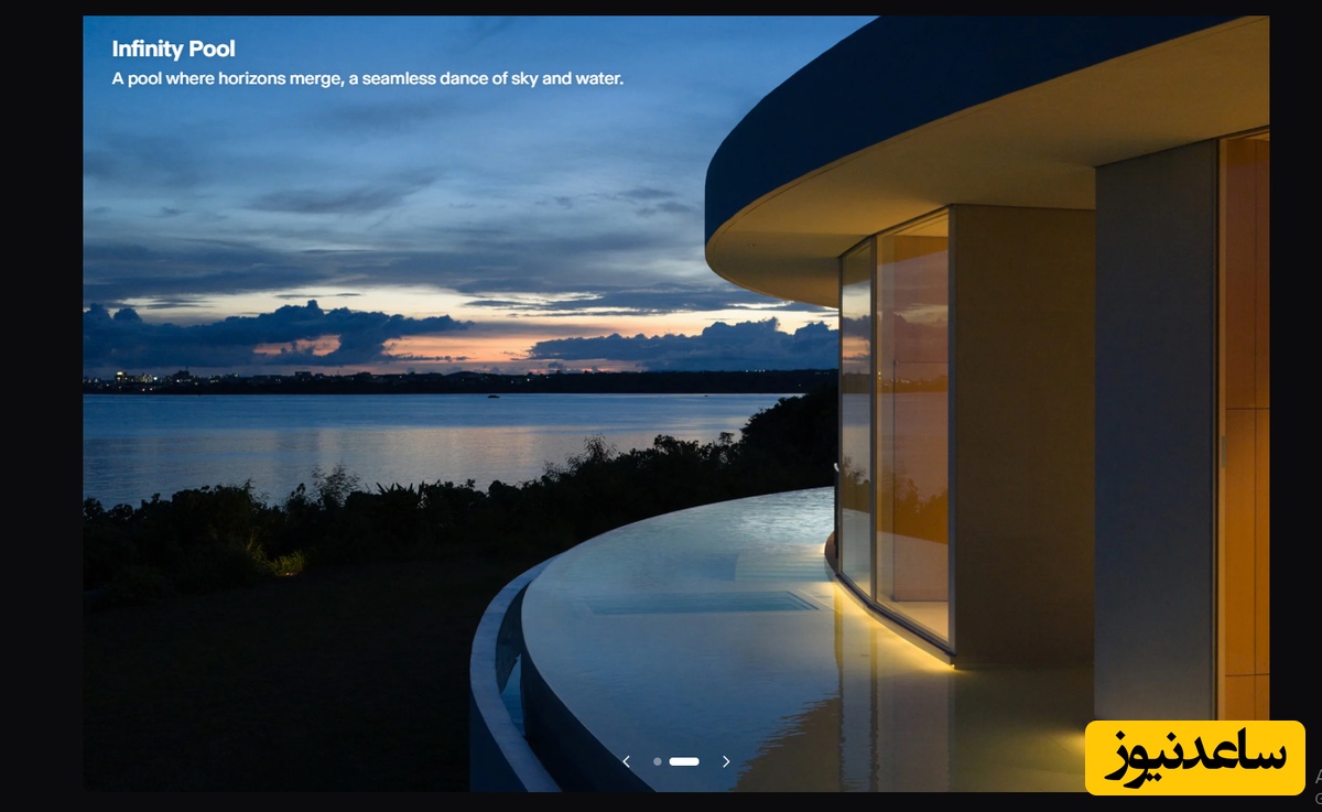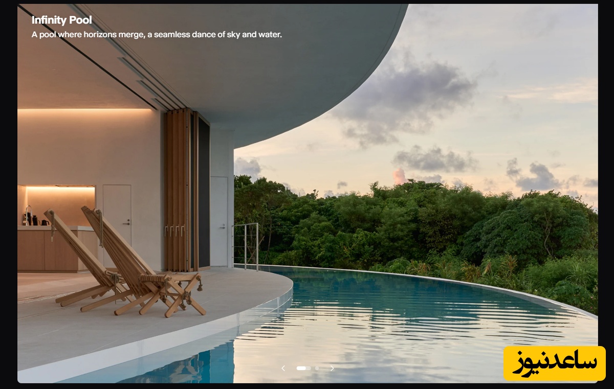 درِ شیشهای بزرگی در این فضا قرار دارد که با باز شدن آن، مهمانان مستقیماً به استخر بیپایانی دسترسی دارند که در امتداد خط منحنی خانه کشیده شده است. این ویلا ظرفیت پذیرش 10 مهمان را دارد و علاوه بر نشیمن و سه اتاق خواب، دارای اتاق بازی برای کودکان و حمامی با وان کمارتفاع رو به استخری کمعمق در فضای باز است.