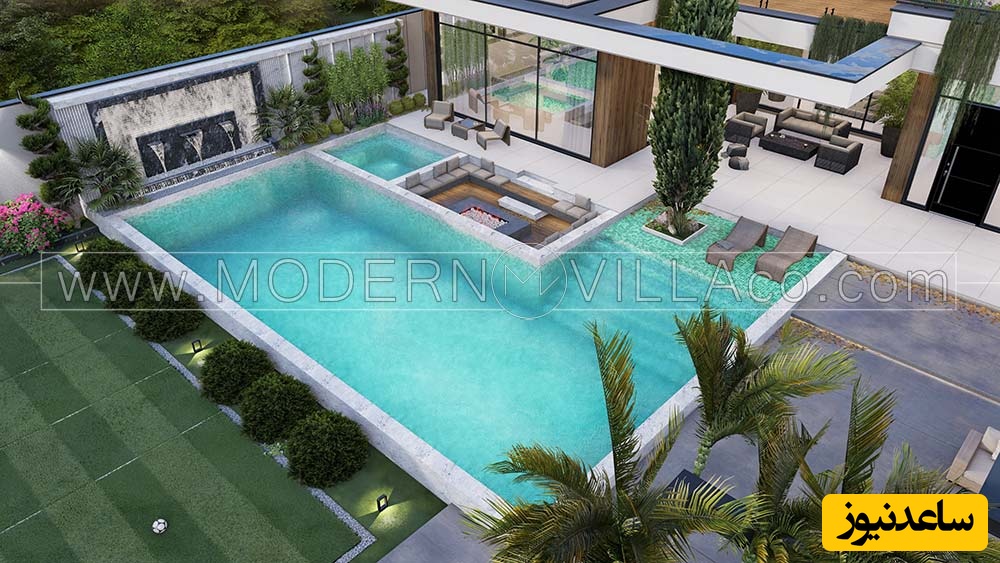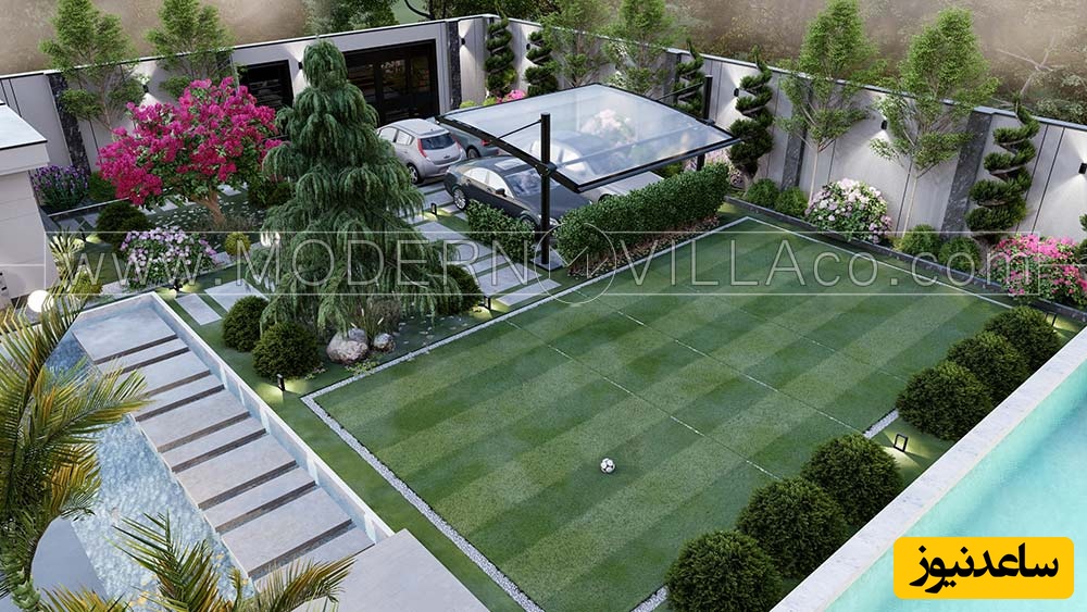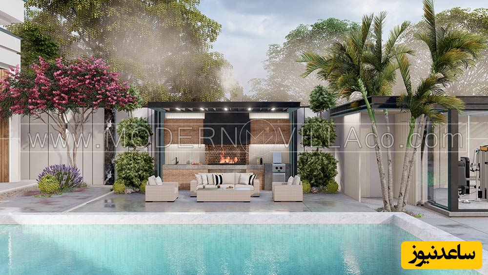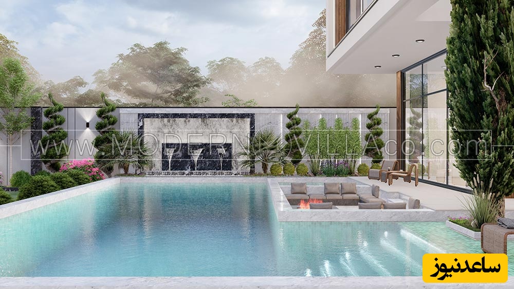 در مورد محوطه ویلا، در لنداسکیپ شاهد پیوستگی میان حجم ویلا و عناصر محوطه به وضوح دیده میشود. ترکیب حجم ویلا و استخر، وجود یک تک درخت در مرکز حجم از جمله شاخصههای بارز در محوطه سازی ویلا است.