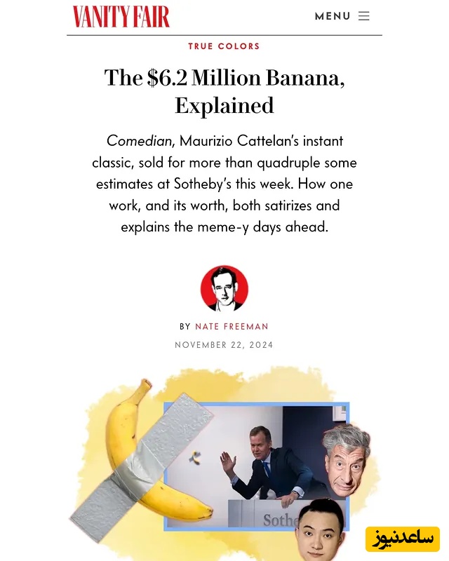 شاید باورتون نشه که این موز به قیمت 6 میلیون و 200 هزاردلار در مزایده به فروش رفت. اون هم نه خودِ موز؛ چون یه موز معمولی بعد از چند روز خراب میشد! در واقع ایدهی اثر وحقِ بازتولیدش بود که 6 میلیون دلار فروخته شد.