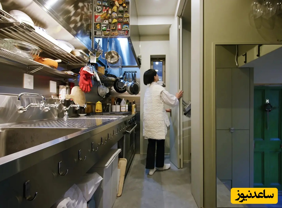 آشپزخانه استیل کامل جدا از نشیمن با فضای ذخیره زیر پا