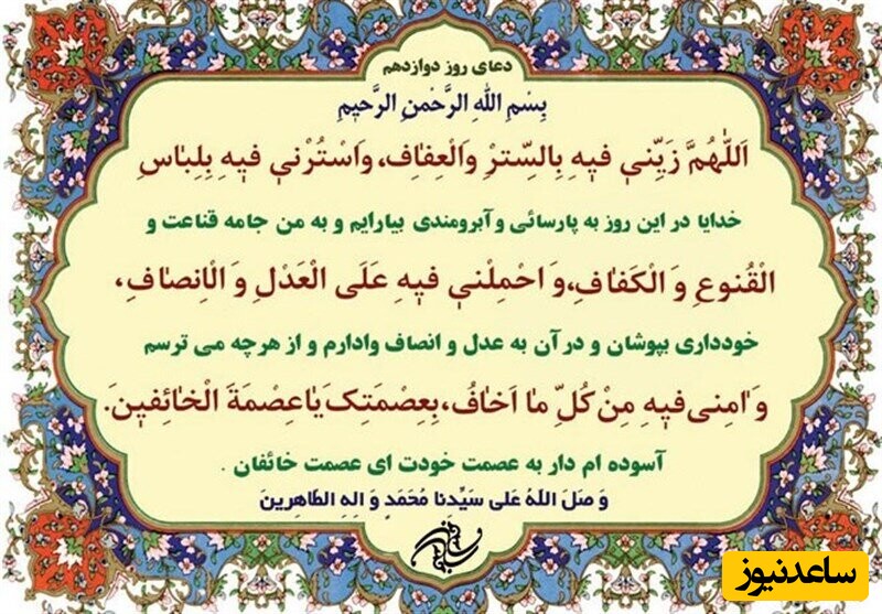 خدایا زینت ده مرا در آن با پوشش و پاکدامنی و بپوشانم در آن جامه قناعت و خودداری و وادارم نما در آن بر عدل و انصاف و آسودهام دار در آن از هر چیز که میترسم به نگاهداری خودت ای نگهدار ترسناکان.