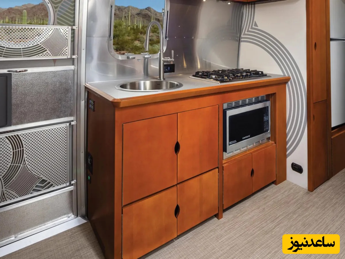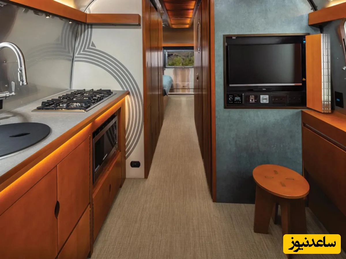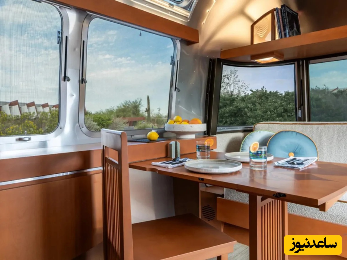 جزئیات دستساز در دکوراسیون داخلی کاروان، از جمله نقش برگ الهامگرفته از نماد شرکت معماری رایت که هنرمندانه در اثاثیه درج شده است، احساسی صمیمی القا میکند.