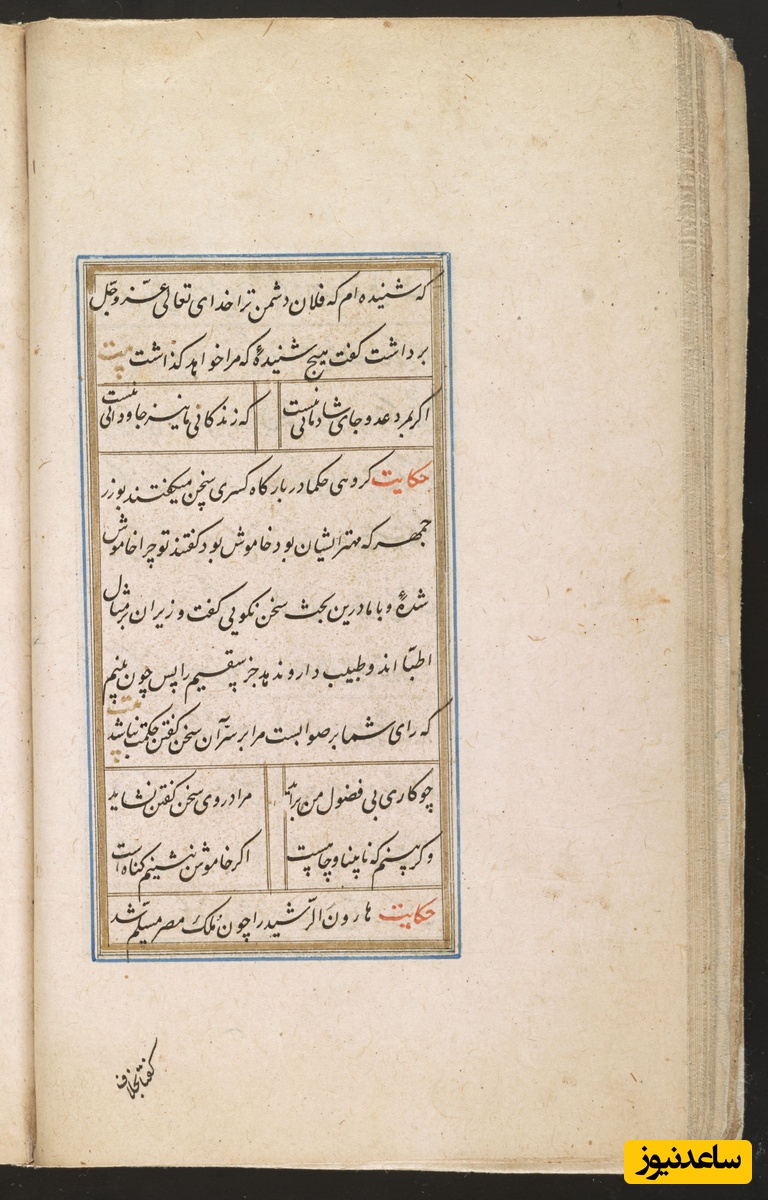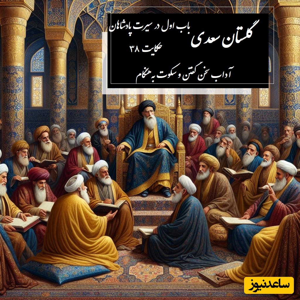 # گروهی حکما به حضرتِ کسریٰ در، به مصلحتی سخن همیگفتند و بزرگمهر که مهترِ ایشان بود خاموش.