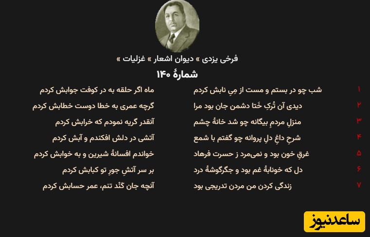 به گزارش سرویس فرهنگ و هنر ساعد نیوز، میرزا محمد فرخی یزدی ملقب به تاج الشعرا (1268 شمسی – 25 مهر 1318 شمسی) شاعر و روزنامهنگار آزادیخواه و دموکرات صدر مشروطیت است. وی سردبیر روزنامهٔ طوفان بود. او همچنین نمایندهٔ مردم یزد در دوره هفتم مجلس شورای ملی بود و در زندان قصر کشته شد. مدفن او ناشناخته است.