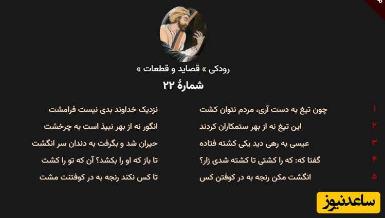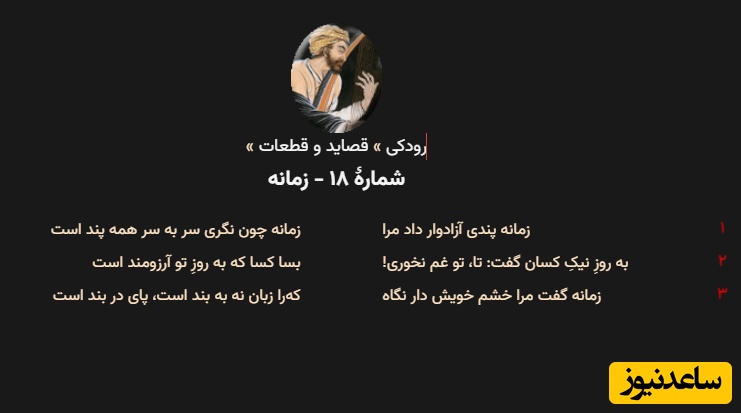 به گزارش سرویس فرهنگ و هنر ساعدنیوز، ابوعبدالله جعفر بن محمد بن حکیم بن عبدالرحمن بن آدم رودکی سمرقندی؛ زادهٔ اواسط قرن سوم هجری قمری (شاید 244 قمری) از شاعران ایرانی دورهٔ سامانی در سدهٔ چهارم هجری قمری است. او استاد شاعران آغاز قرن چهار هجری قمری ایران است. رودکی به روایتی از کودکی نابینا بوده است و به روایتی بعدها کور شد. او در روستایی بهنام بَنُج رودک در ناحیهٔ رودک (پنجکت در تاجیکستان امروزی) در نزدیکی نخشب و سمرقند به دنیا آمد. رودکی را نخستین شاعر بزرگ پارسیگوی و پدر شعر پارسی میدانند. وی در دربار امیر نصر سامانی بسیار محبوب شد و ثروت بسیاری به دست آورد، با این حال در سالهای پایانی عمر مورد بیمهری امیران قرار گرفته بود. او در اواخر عمر به زادگاهش بنجرود بازگشت و در همانجا به سال 329 هجری (941 میلادی) درگذشت.