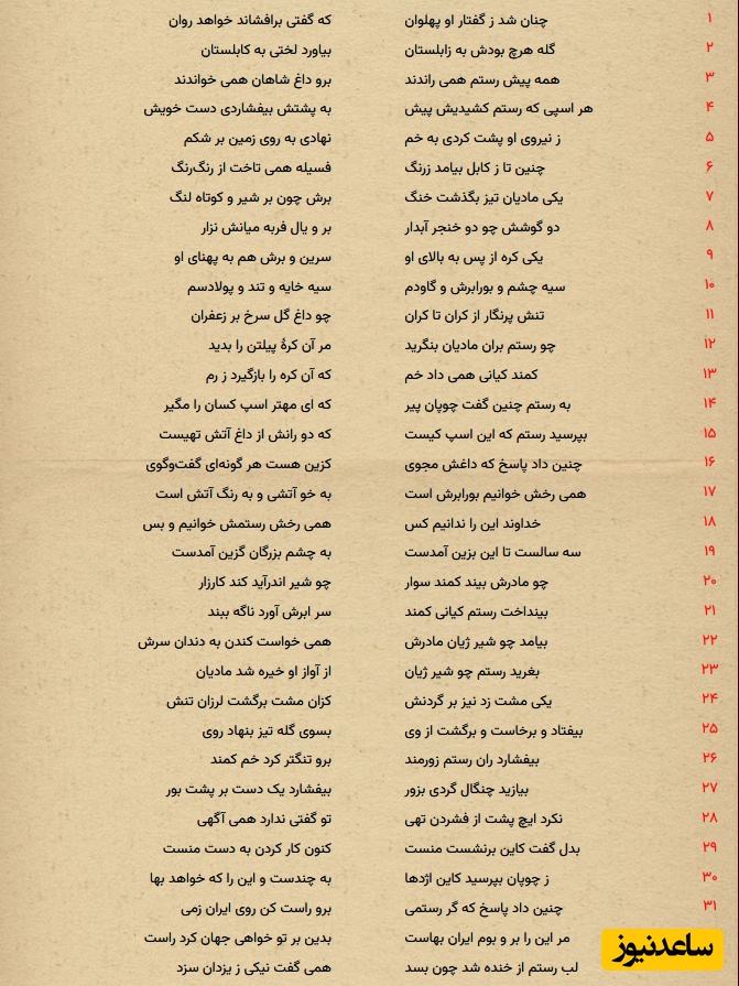 به گزارش سرویس فرهنگ و هنر سرویس ساعدنیوز، یکی از بزرگترین حماسههای منظوم جهان، کتاب شاهنامه فردوسی، اثر ابوالقاسم فردوسی است. این اثر شامل حدود 50,000 تا 61,000 بیت است و به اساطیر، حماسهها و تاریخ ایران از آغاز، تا حملهی اعراب میپردازد. شاهنامه در سه بخش اسطورهای، پهلوانی و تاریخی نگاشته شده و تأثیر عمیقی بر فرهنگ و ادبیات کهن فارسی داشته است. این کتاب به بسیاری از زبانهای زندهی جهان نیز ترجمه شده است.