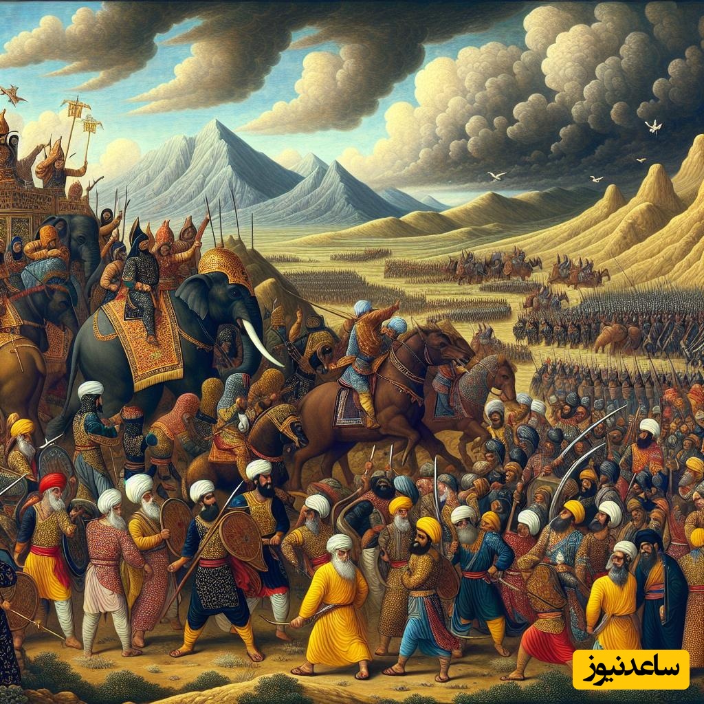 هوش مصنوعی: رستم، پهلوان بزرگ، در جلوی میدان قرار دارد و در عقب او، فردی سالخورده و حکیم نیز حضور دارد.