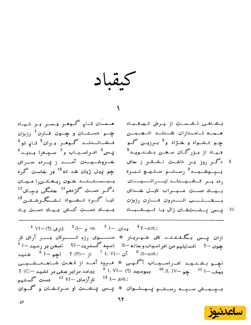 در این متن، داستانی از قیام کیقباد و نبردی بزرگ روایت میشود. کیقباد بر تخت شاهی نشسته و تاجی زینت سر خود میکند. بزرگانی چون دستان و قارن در این اجتماع حاضر میشوند. روز بعد، لشکر به راه میافتد و رستم، قهرمان ایرانی، آماده نبرد میشود. ایرانیان به نبرد میپردازند و رهبری رستم و دیگر دلیران ملّی را به دست میگیرند.