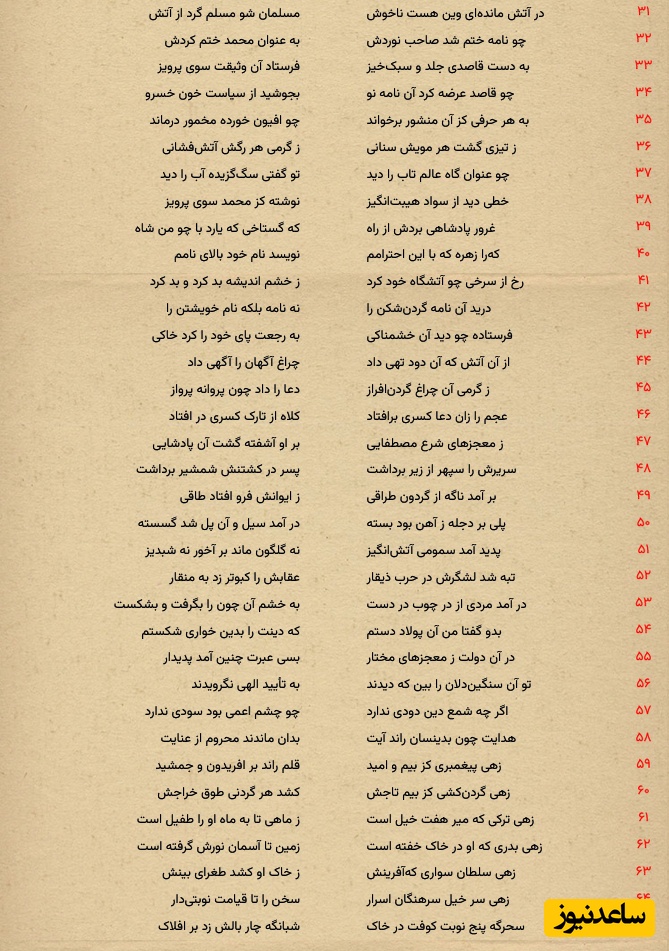 روزی پیامبر اسلام، نامهای به خسرو پرویز، پادشاه ساسانی ایران، نوشت و در آن از او خواست تا از آتشپرستی دست بردارد و به دین اسلام بگرود. نامه با نام خدا آغاز شد و پیامبر با ذکر قدرت و عظمت خداوند، پادشاه را به تفکر و تعظیم در برابر خدا فرا خواند. نامه توسط قاصدی تیزپا به نزد خسرو ارسال شد. زمانی که قاصد نامه را به خسرو رساند، خسرو با خواندن نامه خشمگین و مضطرب شد. او از گستاخی پیامبر ناراحت شد و گفت که چگونه جرئت میکند کسی نام خود را بالاتر از نام او بنویسد. سپس نامه را پاره کرد و خشم خود را با این عمل بیان نمود. فرستاده پیامبر وقتی دید خسرو با نامه چه کرده، بیدرنگ بازگشت. پس از این ماجرا، نشانههای فراوانی از معجزات پیامبر اسلام در کشور خسرو ظاهر شد. ایوان کاخش به ناگاه فرو ریخت، پلی آهنی بر دجله که ساخته بود در اثر سیل خراب شد، و بسیاری از اتفاقات ناگوار دیگر رخ دادند. حتی در جنگی به نام جنگ ذیقار، سپاه ساسانی شکست خورد، و حوادثی مانند حمله عقاب به کبوتر رخ داد که نشانهای از تضعیف قدرت او بود. این وقایع به نوعی تأثیر دعوت پیامبر بر پادشاهی خسرو پرویز را نشان میداد و به رغم دیده شدن معجزات، بسیاری از افراد همچنان ایمان نیاوردند و کفر ورزیدند.